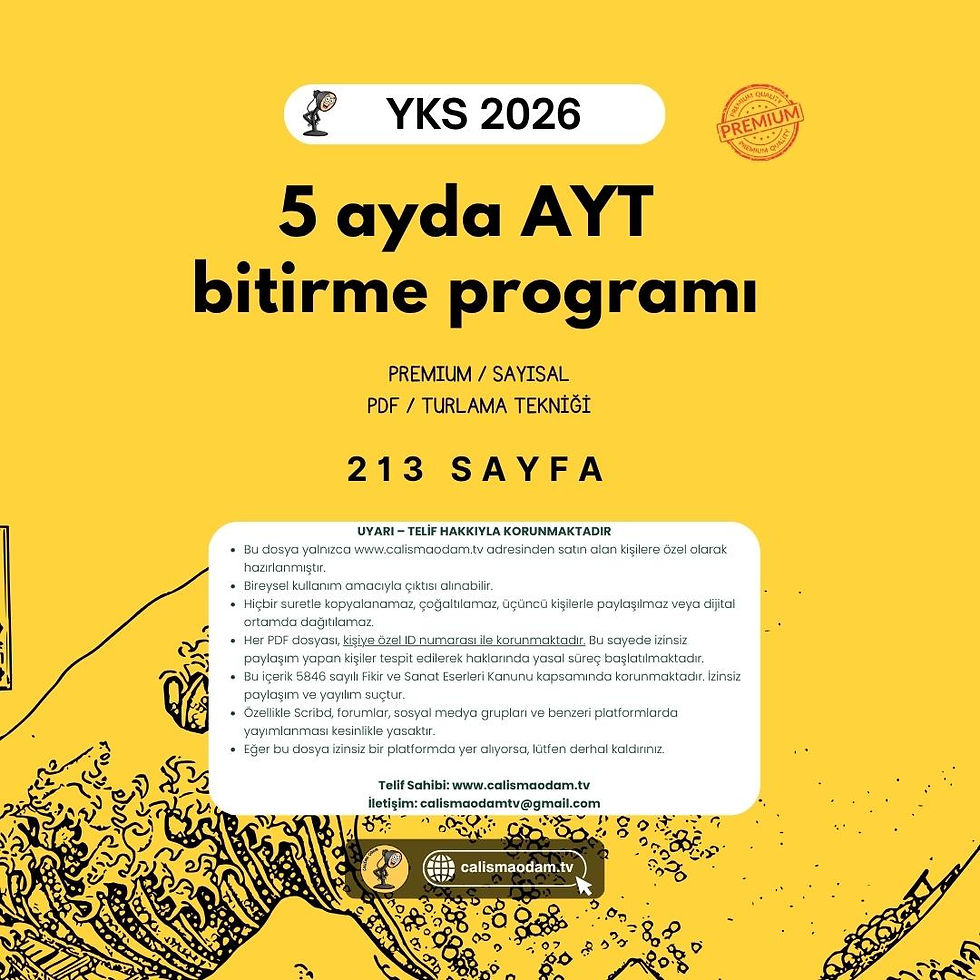 Not: Belirtilen süreler yalnızca konu çalışma süreleridir. Ekstra soru çözümü ve tekrar için ayrıca zaman ayırmanız gerekir. Hazırladığımız programlar, 1. tur yani konu öğrenme sürecini kapsamaktadır. 2. ve 3. tur için ayrıca süre planlaması yapmalısınız. Örneğin, 5 Ayda AYT Bitirme Programı ile tüm konular ilk 5 ayda tamamlanır, ardından 2. tura geçilerek yoğun soru çözümü ve pekiştirme süreci başlar.